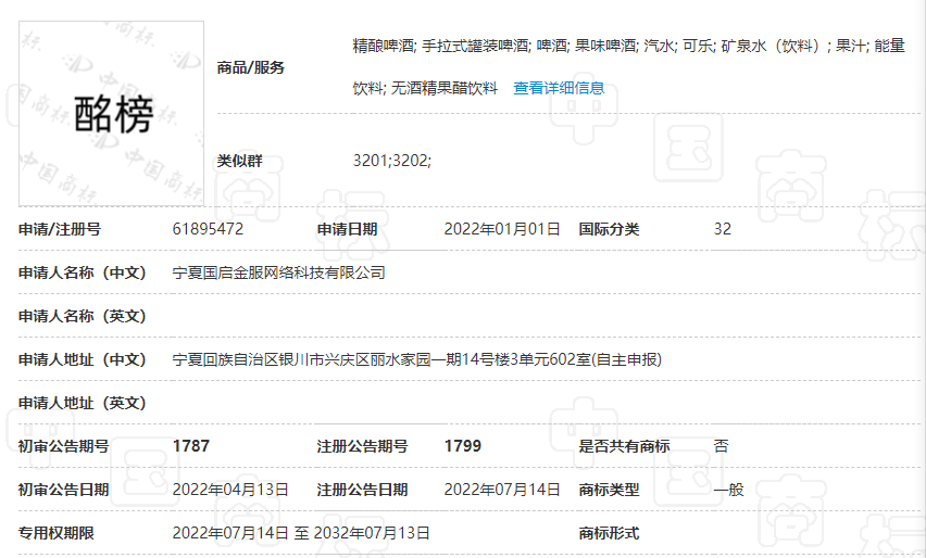 酩榜——第32類商標(biāo),可做原漿、奶茶、飲料、礦泉水、啤酒等
